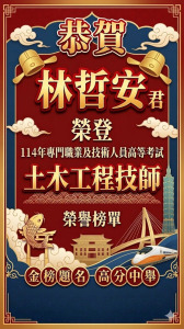 蘇 意雯2026-03-17 10:17:512026-03-17 10:17:51賀本系系友林哲安通過土木技師考試
